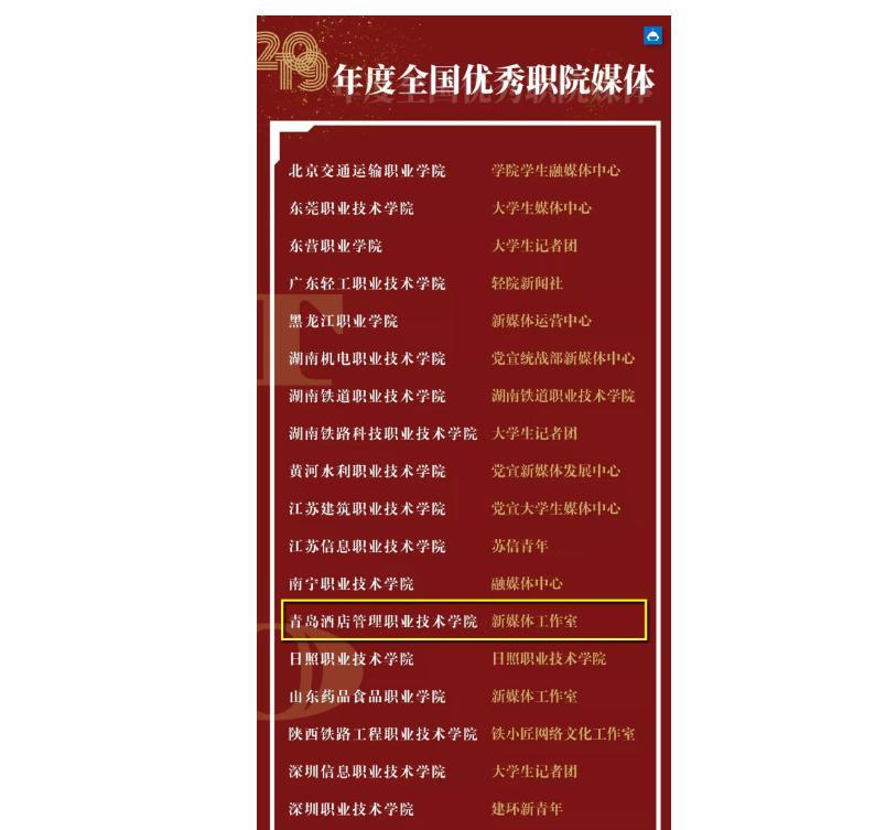 近年来,学院积极做好全媒体传播体系建设,注重挖掘内容、借助技术、创新思路,聚人心树形象,构建网上网下、内外宣联动的宣传矩阵。在1月13日中国青年报社和中青校媒公布的2019年度全国百强校媒名单中,青岛酒店管理职院入选优秀职院媒体30强。